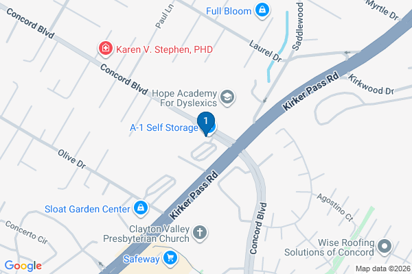 5296 Concord Blvd Concord, CA 94521(925) 825-5100Get DirectionsVisit LocationPhotograph of A-1 Self Storage - Concord storage facilityA-1 Self Storage - ConcordReviews(135)1Click to focus this facility on the map and view details5296 Concord Blvd Concord, CA 94521(925) 825-5100Available Units
